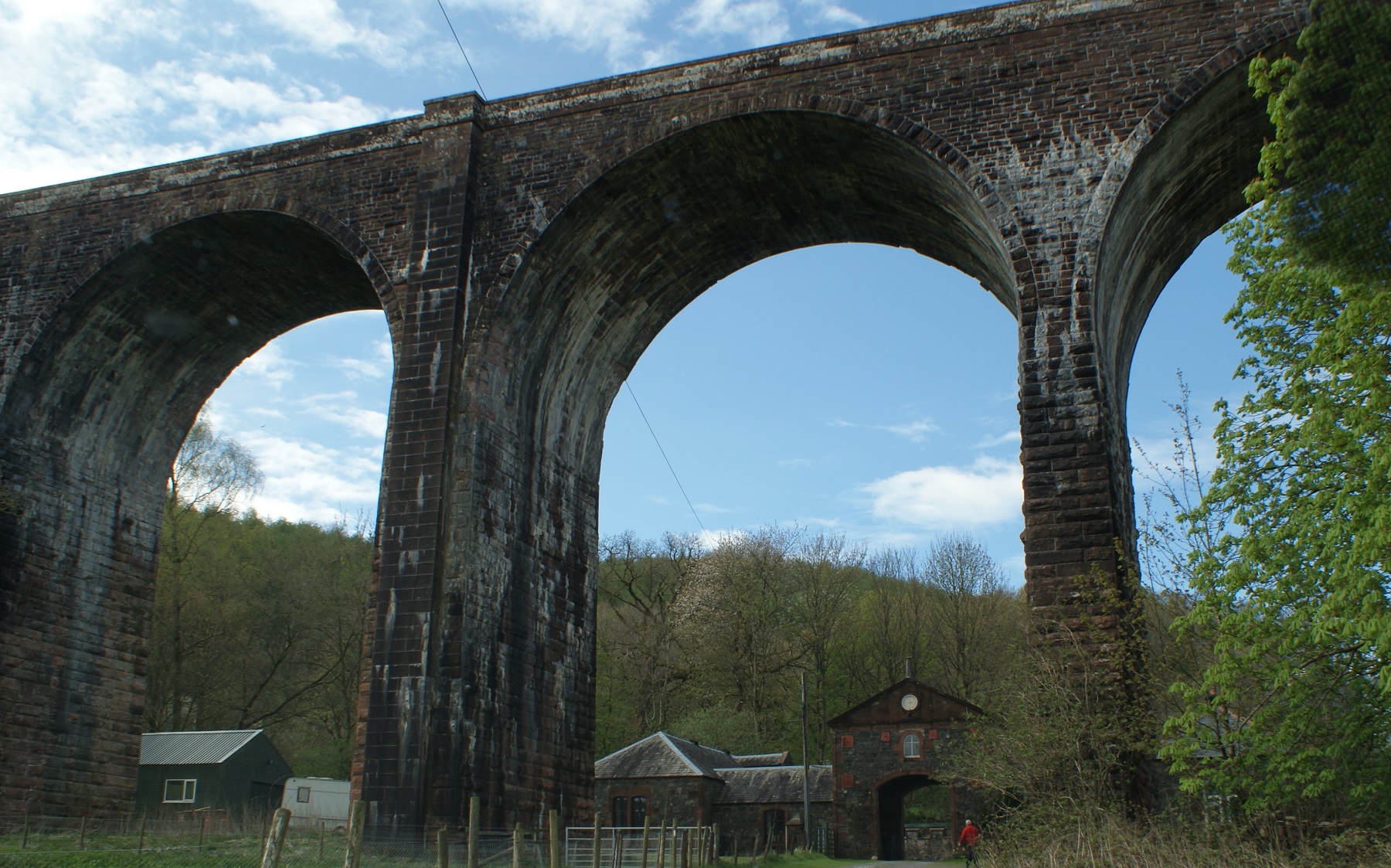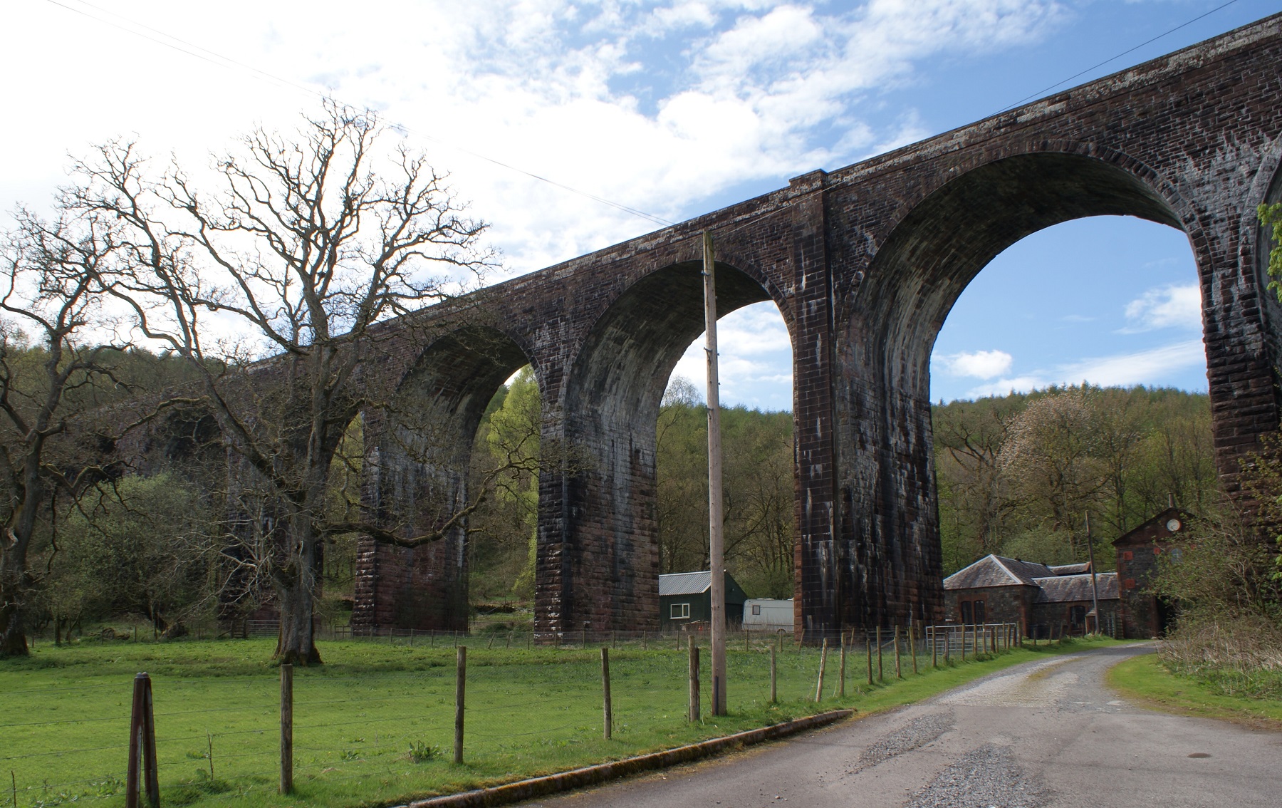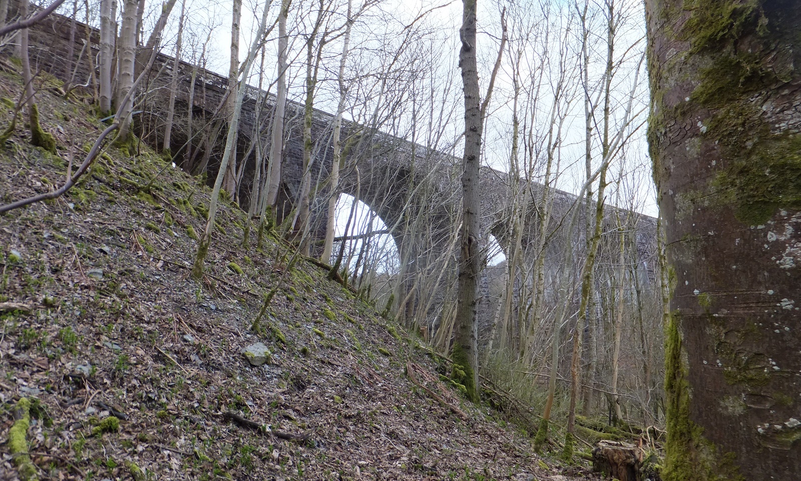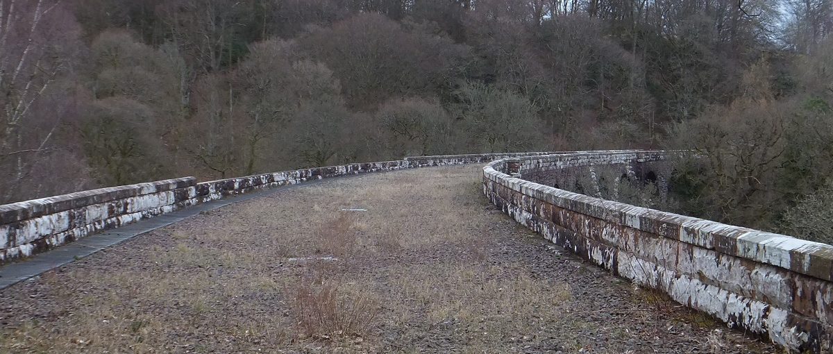 Some pictures of Goldilea Viaduct west of Dumfries, entrance to "the long wood". This viaduct formerly carried the Dumfries-Castle Dougklas-Kirkcudbright branch line of the (former) Glasgow and South Western Railwayy over the valley to the NW of Goldielea House, and within its policies. It is built on a pronounced curve, and crosses the boundary between the parishes of Troqueer (to the NE) and Lochrutton (to the SW)